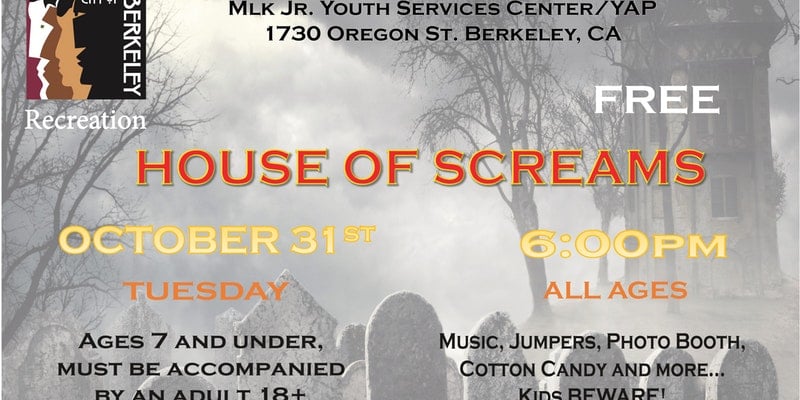Ready to explore the largest haunted house in Berkeley? The House of Screams will be open on Halloween from 6 to 9PM. Get your best Halloween outfit ready for an evening of music, cotton candy, photo booth, fright and jumpers for the little goblins.