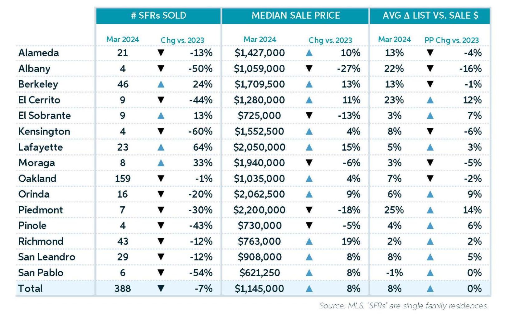 Looking at all of Q1 2024 (Jan-Mar), the Inner East Bay real estate market is recovering from a fairly weak 2023. The number of listings and sales are on the increase, and specific listings and neighborhoods are experiencing significant price increases. But in other cases, median price is down slightly and some properties receive no offers.