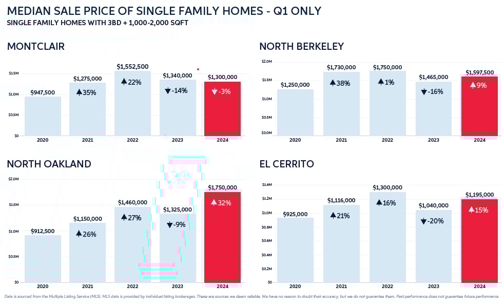 That being said, properties that are attractive to buyers (as defined by condition, location, and list price) are generating high levels of competition. For example, if you look only at 3BD single family home prices between 1,000 and 2,000 square feet (Q1 2024 vs. 2023), prices in North Berkeley are up 9%, 15% in El Cerrito, and 32% in North Oakland. Only Montclair is down slightly by 3%.