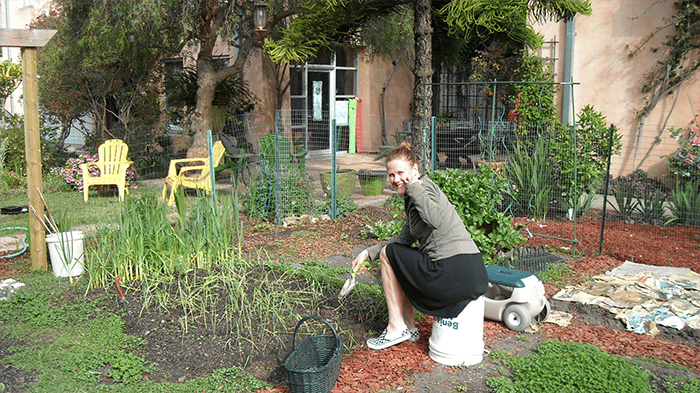 On 8,000 square feet of reclaimed land and surrounded by a tall gate, the community, established in 1990, features a central garden, a chicken coop and bees. The community has approximately 30 members who share the communal garden and taking care of the land.