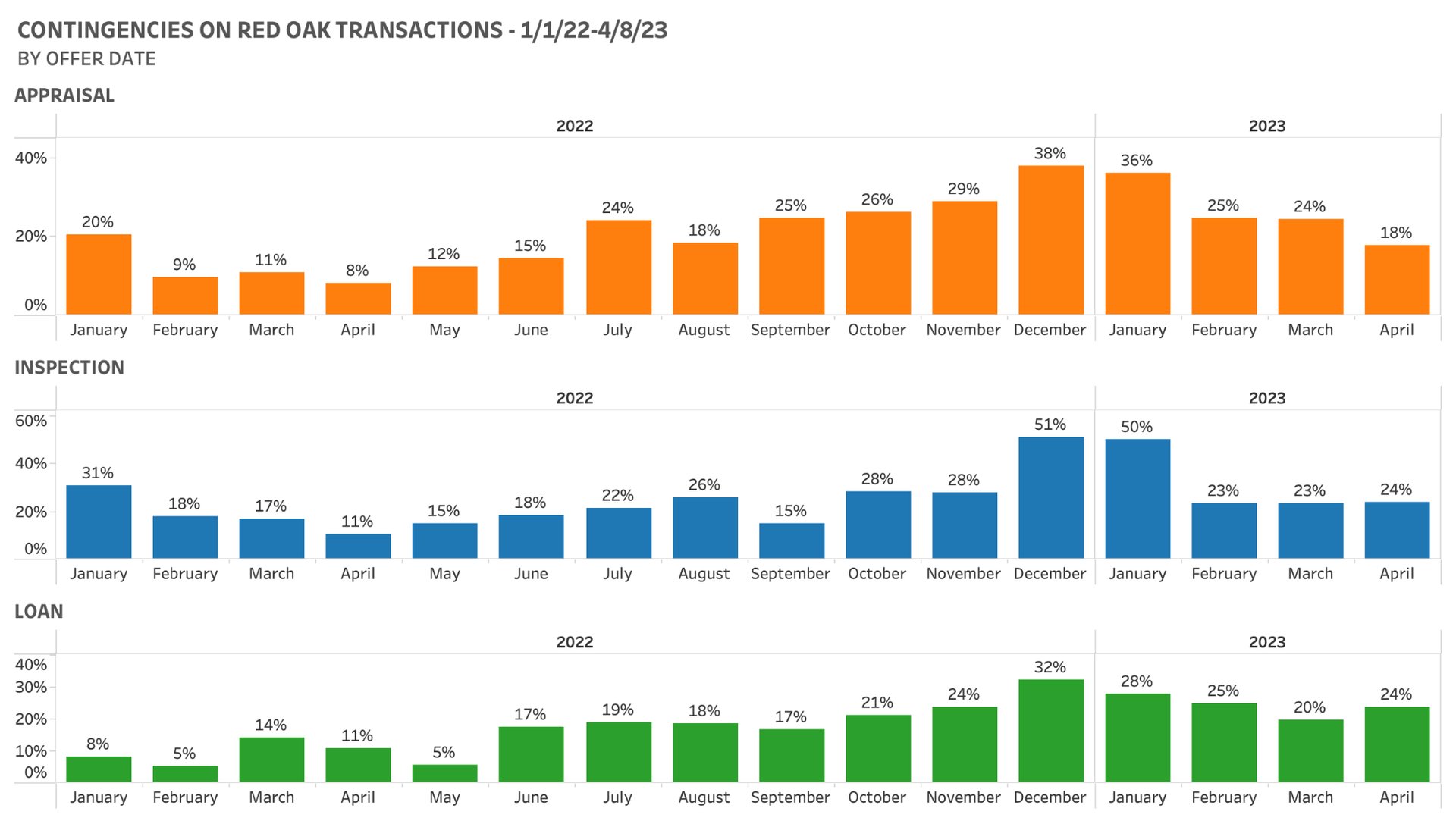 In the East Bay, the use of contingencies decline when it’s more of a sellers’ market, and they rise when it’s more of a buyer’s market. You can see this in the chart below, which reflects the use of contingencies for Red Oak transactions since January 2022. However, even in the strongest buyers markets, such as the winter of 2022, less than half of transactions use a contingency.