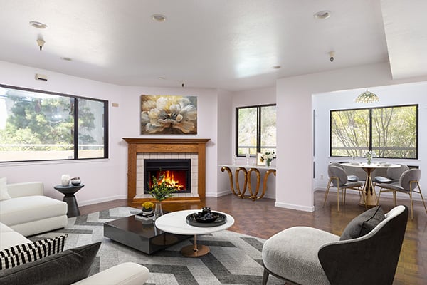 Light filled Mid-century home! Impressive fireplace, hardwood floors, sliding doors open to the private garden.