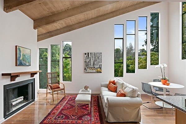 Two-story corner unit. Open floor plan, light-filled spaces, beam ceilings, & wood-burning fireplace.
