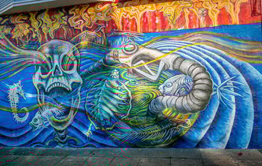 Not as prolific as Oakland, Berkeley still holds its own when it comes to public murals, some pieces dating back as far as 50 years! In addition to making a neighborhood more vibrant, murals are often commissioned to make a statement. For example, at the corner of Adeline and Emerson Street in Berkeley is a mural by artist and former Berkeley High School instructor, Juana Alicia. Derrame depicts the Gulf Oil Spill in 2010, the worst of its kind in history. Her goal was to raise awareness around the climate emergency.
