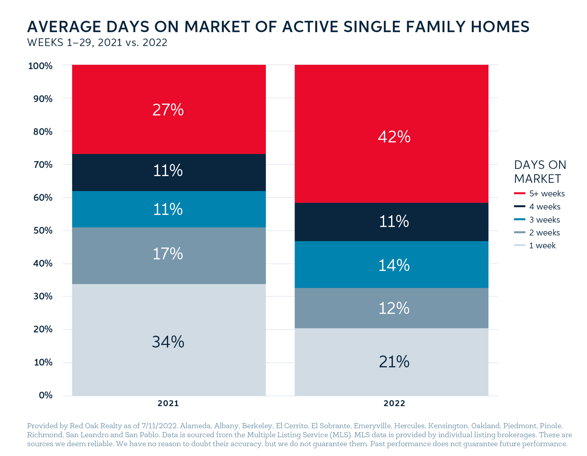 Although buyer activity has been falling, new listings continue to hit the market, creating an imbalance between supply and demand. As a result, key metrics in the East Bay are faltering, driving down median price as well as the amount buyers are willing to pay over the list price, while driving up days on market. For example, looking at active listings by the length of time they have been on the market, 42% of properties have been active for 5 weeks or more; at this time a year ago, only 27% reached this threshold.