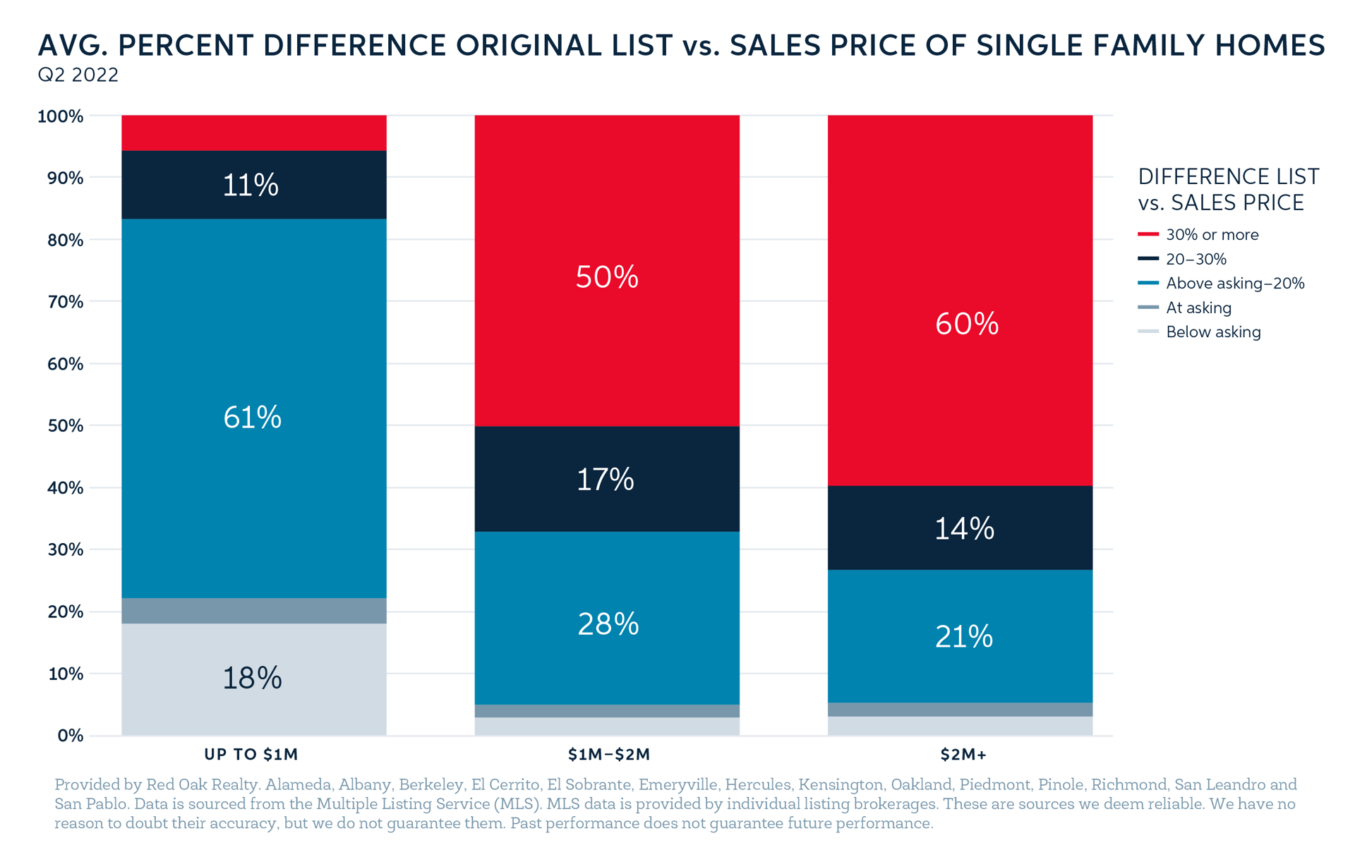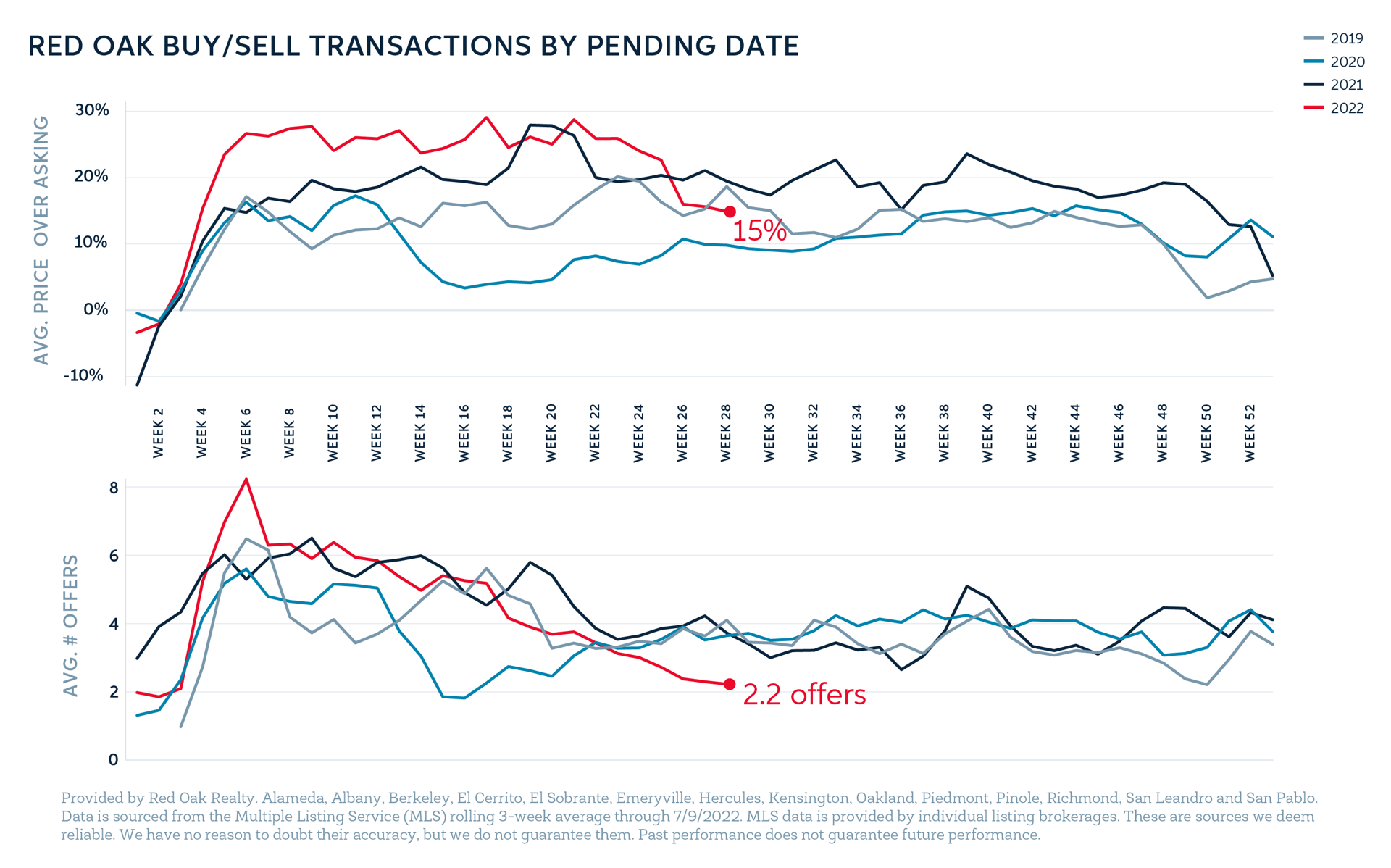 How is the future East Bay market unfolding? By analyzing Red Oak’s internal transaction data by offer date, we can see that the high level of inventory continues to take its toll. Homes are selling closer to asking (an average of 15% over list) and are attracting fewer offers (an average of 2.2, the lowest we have seen for this season since 2014).
