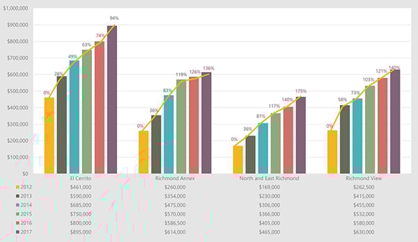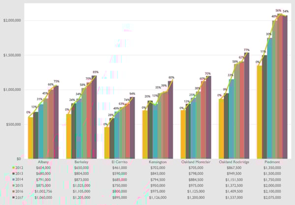 Real estate prices in the East Bay have been steadily climbing since 2012, and predictions are for this year’s market to continue that trend. Our robust job market has created a very high demand for housing throughout the Bay Area, especially for homes within quick commute distance of job centers, preferably within walking or biking distance to BART. The East Bay is more affordable than San Francisco, Marin, and the South Bay, so there is particular pressure here from first-time home buyers.