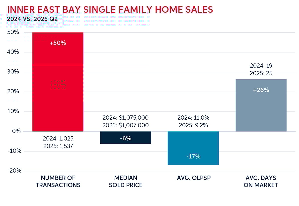 Sales of single-family homes across the Inner East Bay surged 50% year-over-year, from 1,025 in Q2 2024 to 1,537 this past quarter—one of the strongest seasonal turnarounds in recent memory. However, median sale prices declined modestly by 6.8%, settling at $1,007,000. Homes also took longer to sell, with average days on market increasing from 19 to 25, giving buyers more time and leverage.