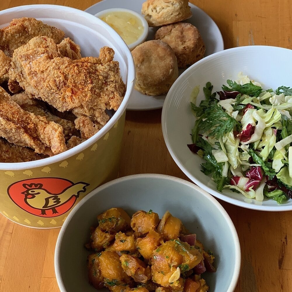 Hopscotch serves American regional classics influenced by Japanese flavors and techniques in Uptown Oakland. They offer a Party Pack featuring some of Hopscotch favorites like buttermilk fried chicken as well as barbecue ribs and sancho five spice rotisserie chicken family meals all with three sides of your choice and feeding 3 to 5 people.