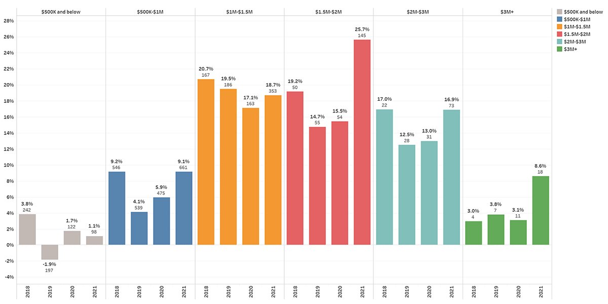 - Single family homes sold in the $1M-$2M range are in the greatest demand. For example, homes $1.5M-$2M are selling an average of 25.7% over asking in just 17 days. However, properties listed in this price range are more likely to cancel than any other.