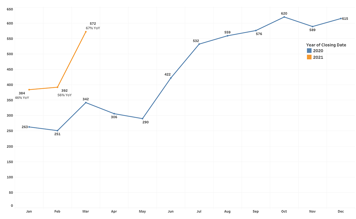- Spring came early this year, with the number of sales growing each month - and 67% in March alone. This drove up the number of sales for the quarter by 57% over last year, the largest increase since 2009. This is partially due to the fact that sales are typically low at the beginning of each year, and they were particularly low in 2020 due to a 30% decrease in supply before shelter in place, and the sudden drop in activity after the order began.