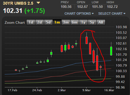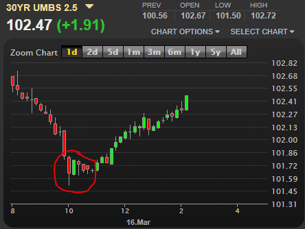 [3/16/20, 11:30am] From Faramarz Moeen-Ziai at Commerce Mortgage: The Federal Reserve announced on Sunday that it is cutting its benchmark rate to 0 percent to support the economy in the wake of the disruption from the COVID-19 virus. The Fed rate is not directly tied to mortgage rates, but is the rate that banks are charged for borrowing money from the Fed. Now that the money is free, the hope is that banks turn around and make that money available to businesses cheaply. The chart below shows the rapid deterioration in price that wiped out all of the gains from 2/14-3/6.