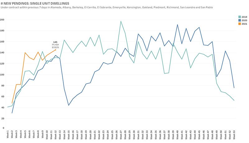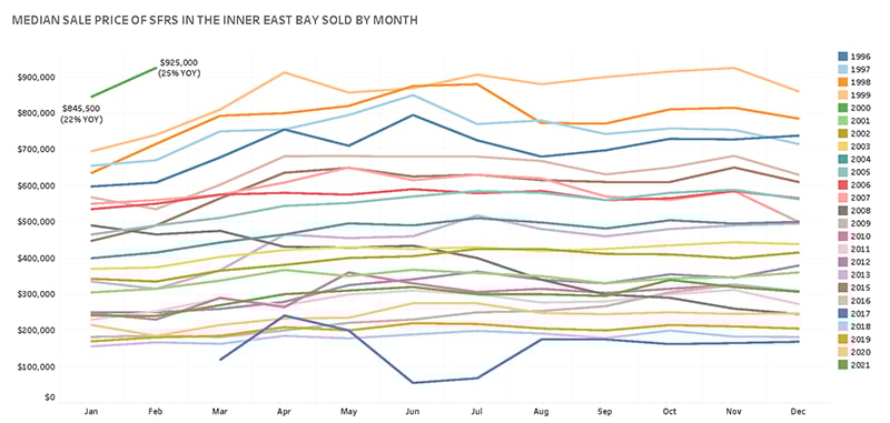 Looking at single family home sales in February 2021 compared to the same period last year in the Inner East Bay (West Contra Costa through San Leandro):