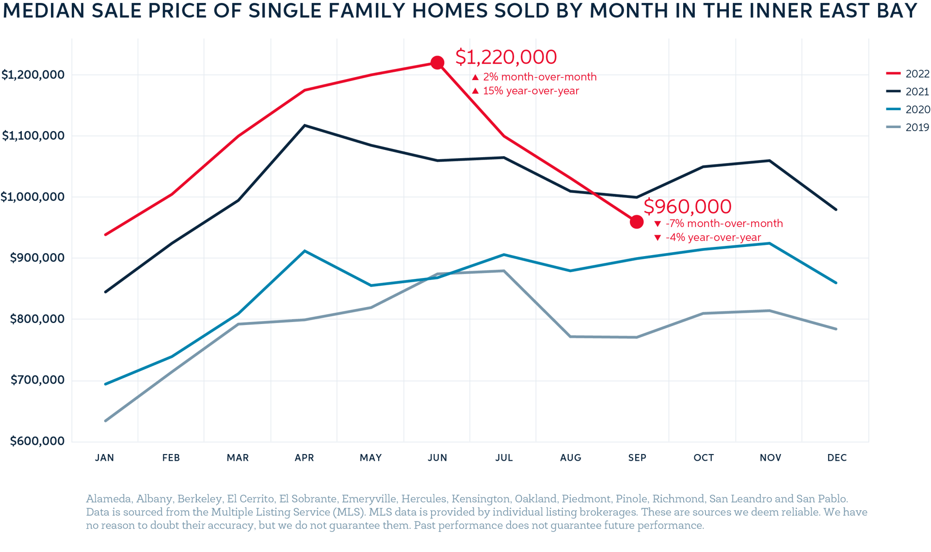 The local market began to experience these changes in early summer, when buyer activity slowed significantly (and everyone seemed to leave town and visit Europe). This beginning of this shift could be seen in July data, and the slowdown has accelerated through September. As a result, the median price of a single family home in the East Bay has fallen 21% between July and September, while it sits 4% lower than the previous year, it is higher than all years prior.