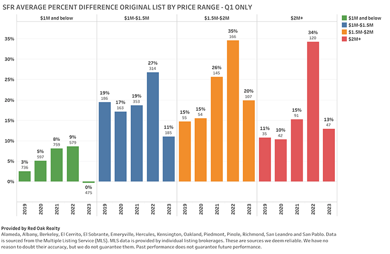 One line is drawn by price: In Q1, the lower end of the market ($1M or below) saw little competition as these homes sold at asking; the “upper middle” of the market ($1.5M-$2M) was most competitive as these homes sold an average of 20% over list price; and the upper end ($2M+) sold 13% over list.