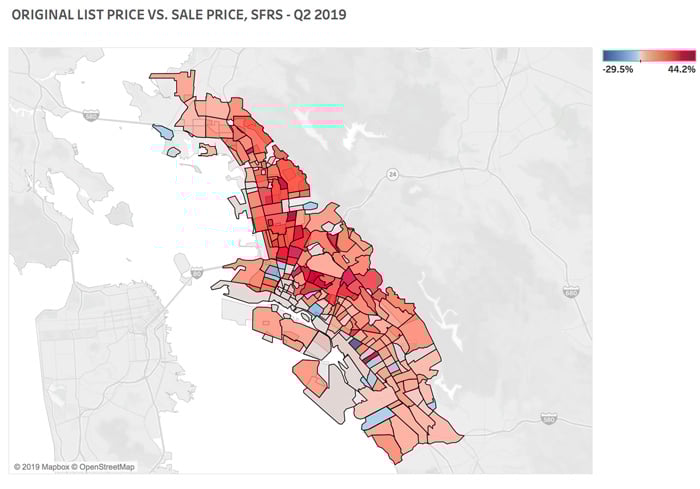 Red Oak Realty maintains a proprietary set of neighborhood-specific data. The list-to-sale-price ratios shown above reveal which East Bay neighborhoods had the hottest real estate markets in the second quarter. Source: Red Oak Realty analysis of MLS data.