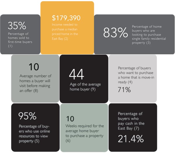 The median price for a home in the Bay Area is currently at $880,000. In one of the most expensive and competitive markets in the country, the Bay Area home buyer has to be tough and ready. Who are these determined and sophisticated people risking repeated rejection and making bid after bid, shooting the moon on price, and frequently waiving their contingencies? It’s not easy to find reliable statistics for every town, but the National Association of Realtors, the Zillow Group and others have done focused surveys and research on the question (see the graphic below).