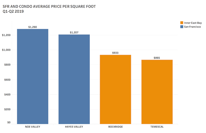 You’ll likely get more bang for your buck in the East Bay, regardless of comparable prices to the city. Check out the median price per square foot of homes in a pair of comparable San Francisco and East Bay neighborhoods around walkability and proximity to coveted amenities: Noe Valley (San Francisco) and Rockridge (Oakland), and Hayes Valley (San Francisco) and Temescal (Oakland).
