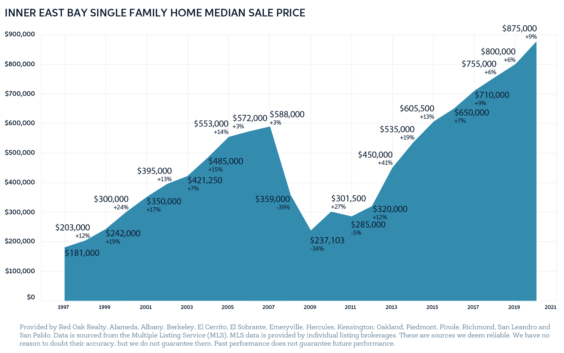 This higher level of seller activity kept inventory at record-high levels (at the end of December, there were more active listings than any time since Red Oak started tracking in 2012). Even though buyers finally had more supply to choose from, the inventory wasn’t enough to meet the demand, which pushed 2020 median prices to an all-time high of $875,000, a 9% increase over the previous year.
