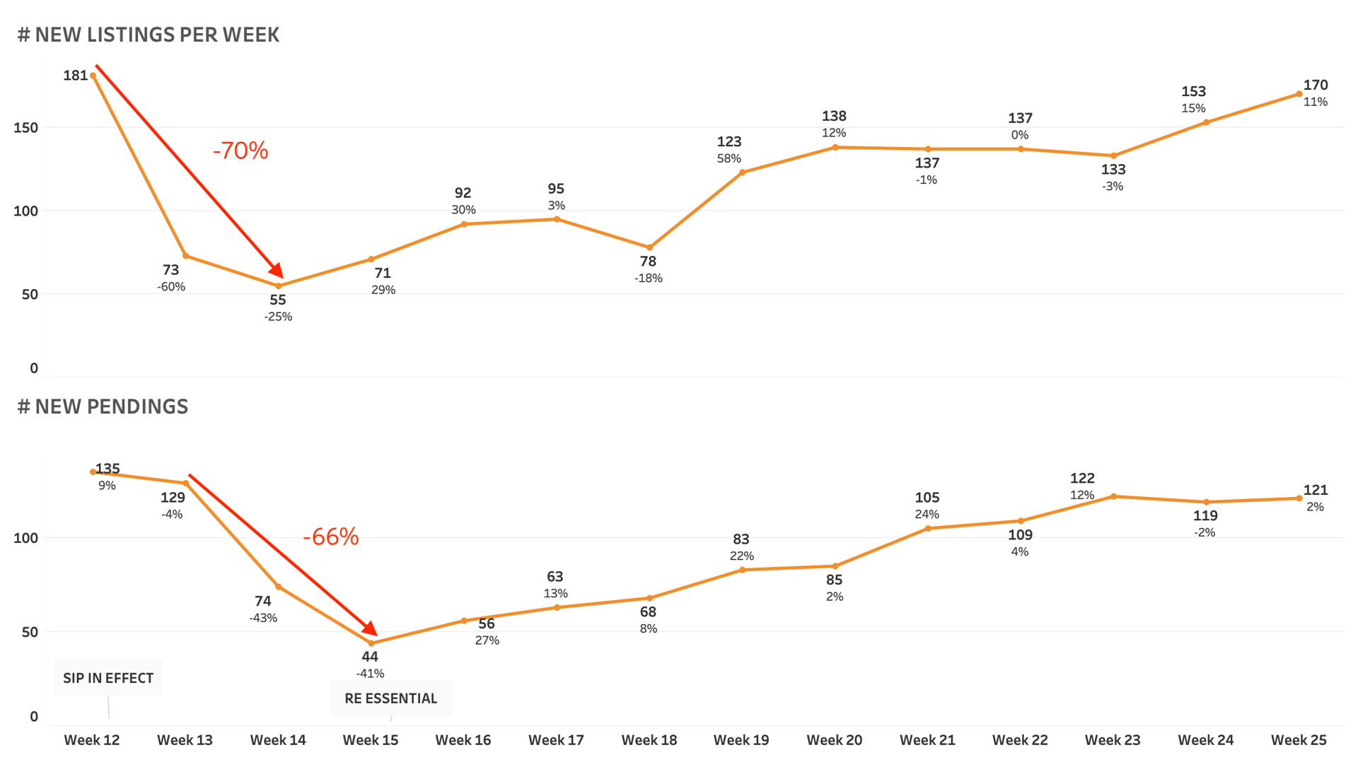 But when SIP went into effect, the number of new listings introduced each week fell by 70% and the number of new contracts written each week fell by 66%.** In other words, supply and demand experienced a monumental shift. Many sellers didn’t know whether there would be any buyers at all for their property.