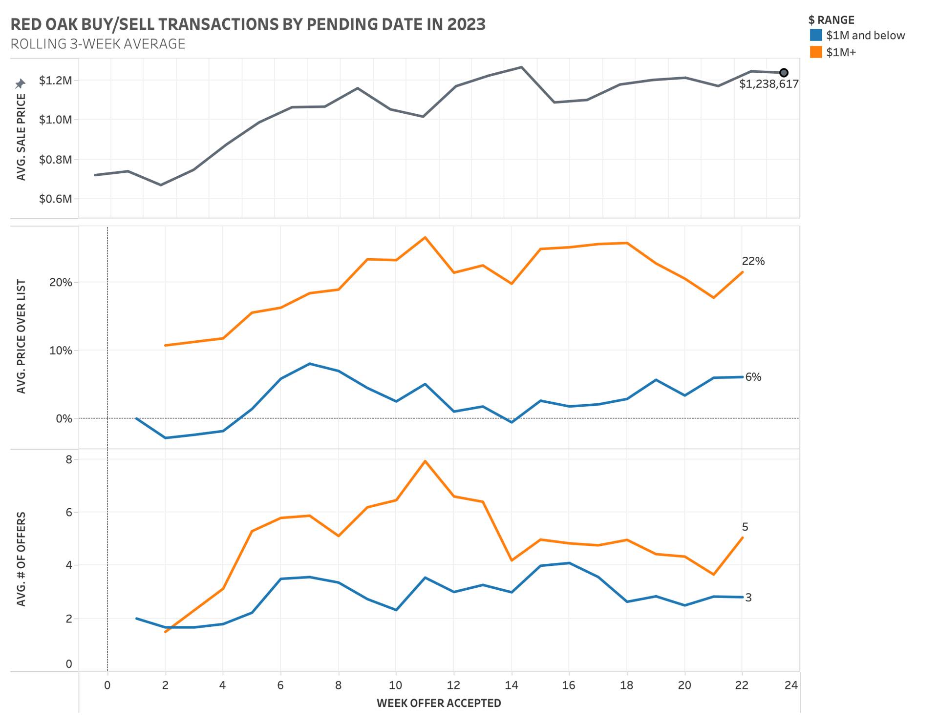 How will this affect your real estate objectives? As usual, it depends. Price appreciation and demand vary considerably depending on price point and of course, location. Data shows that home prices have indeed dropped since a year ago, but notably, bidding wars are still happening in certain areas with the most attractive homes that are move-in ready and priced well. For example, looking at recent Red Oak transactions by their offer date, properties that command a higher price - above $1M - are selling an average of 22% over list with an average of 5 offers, while properties below $1M are selling an average of 6% over list with an average of 3 offers.